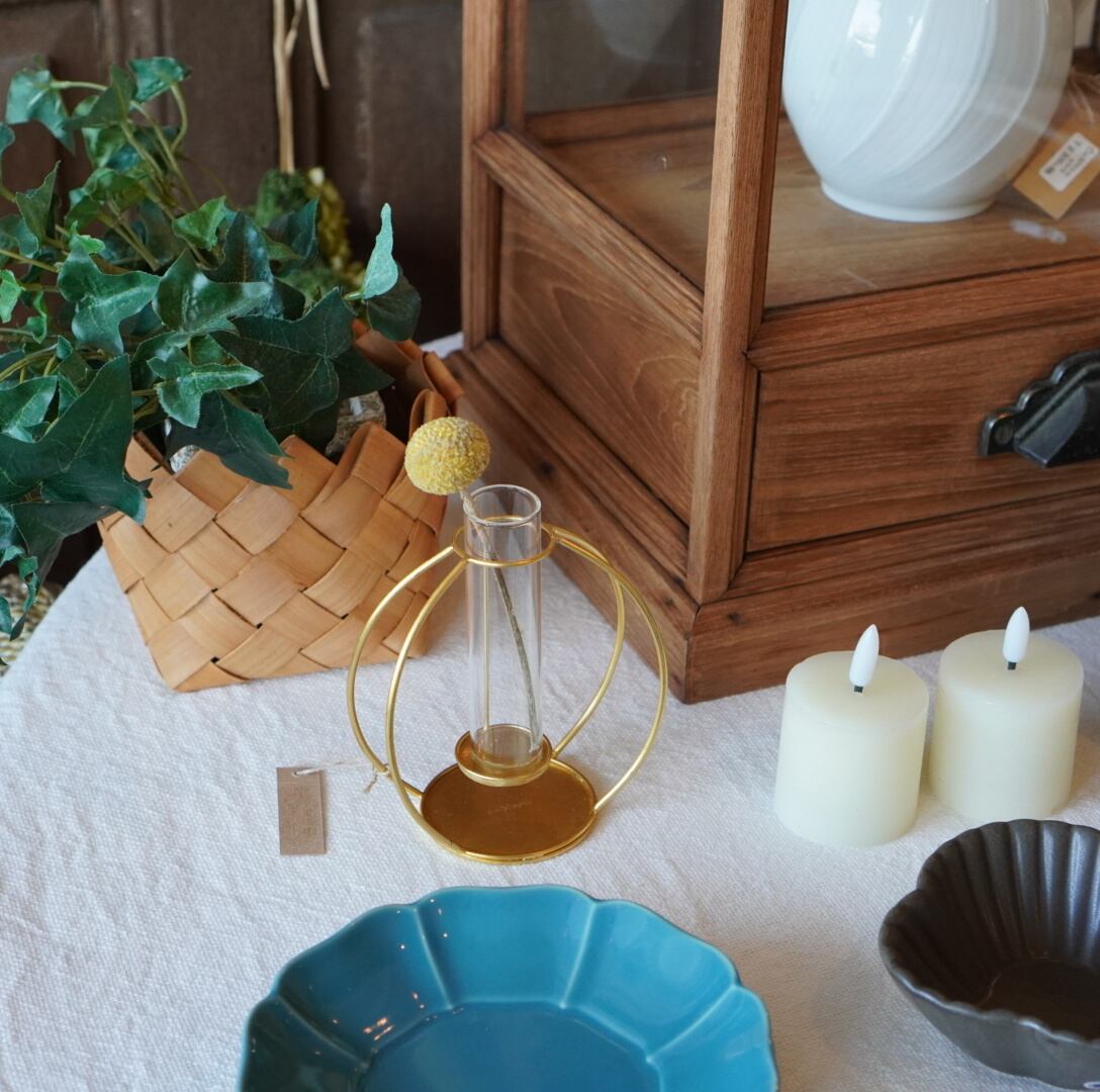 どんなインテリアにも馴染みやすい、ゴールドの一輪挿し。