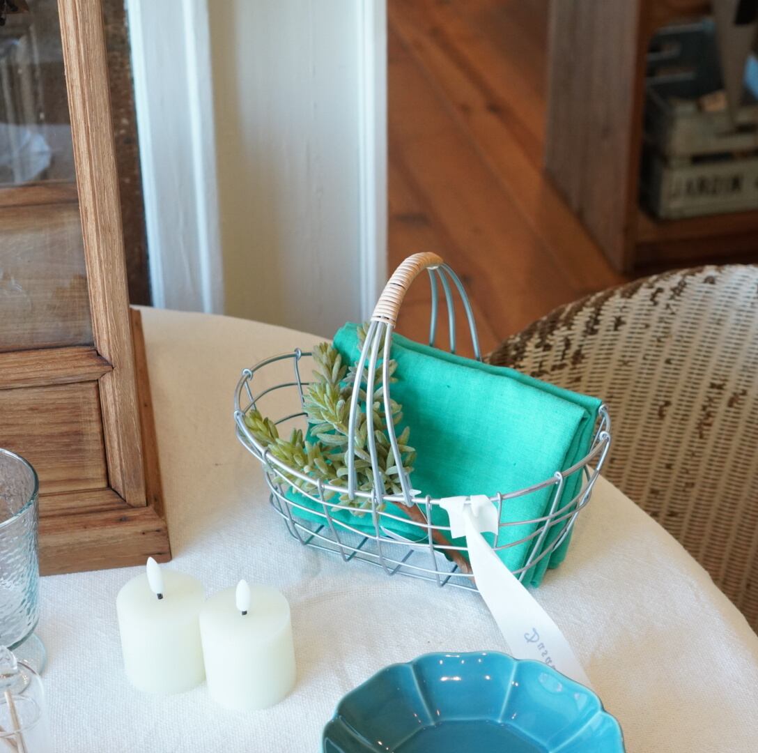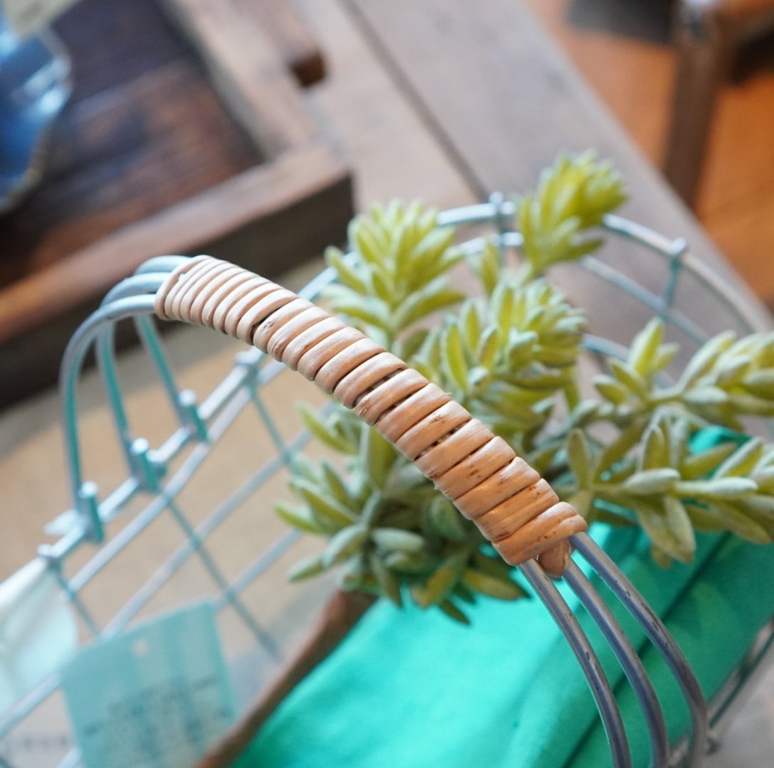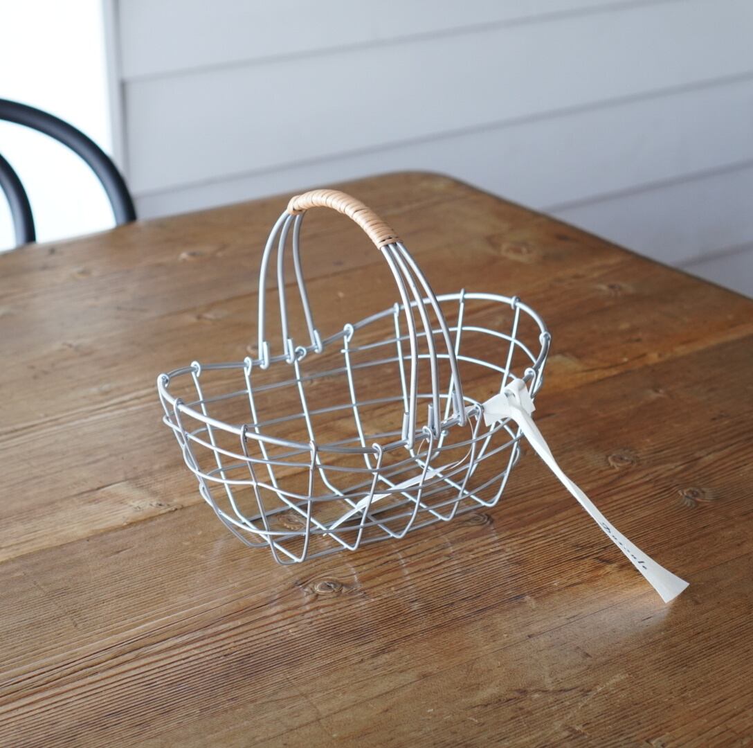 ハンドメイドで編まれた、ワイヤー製のワンハンドルバスケット。
