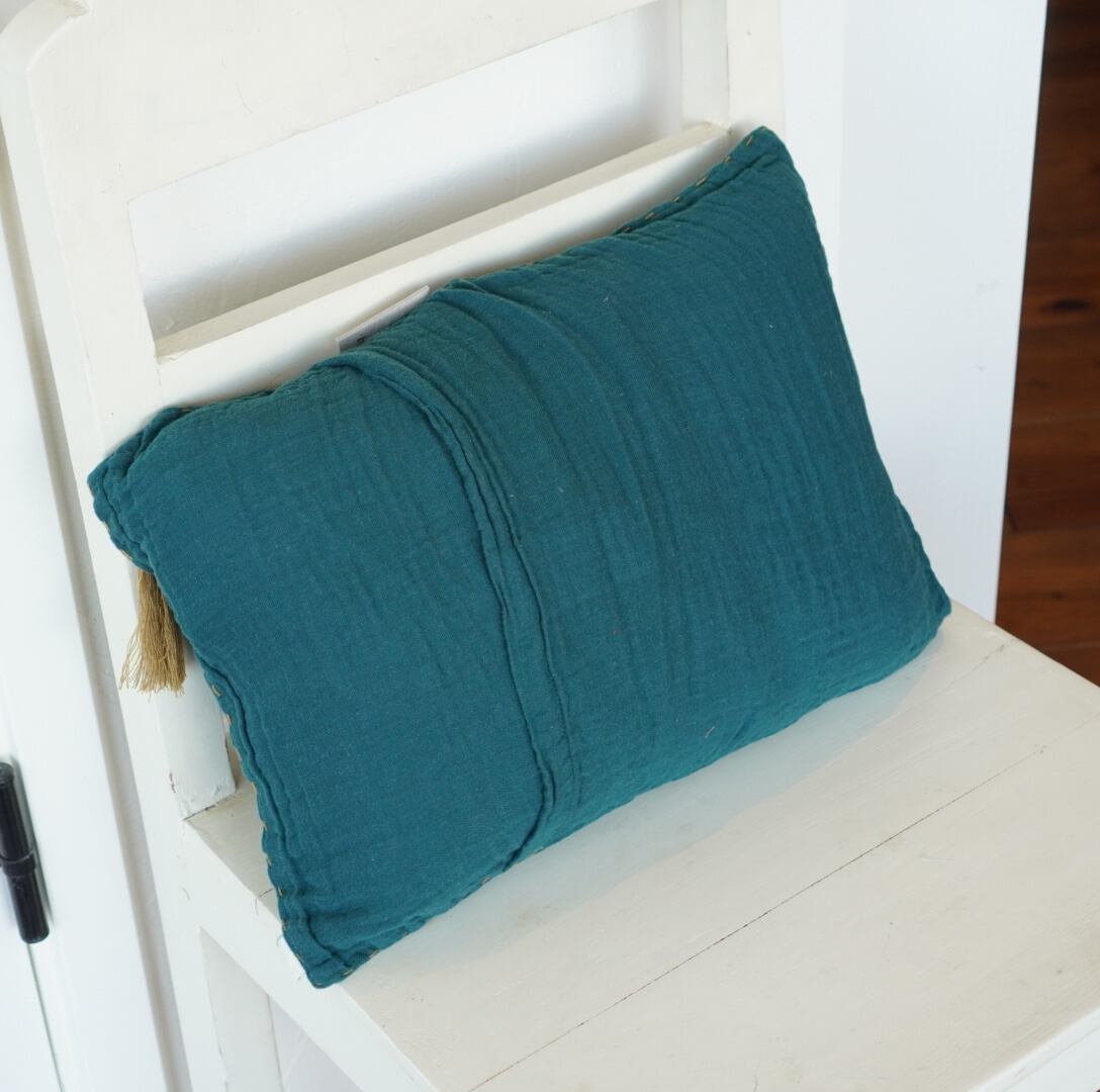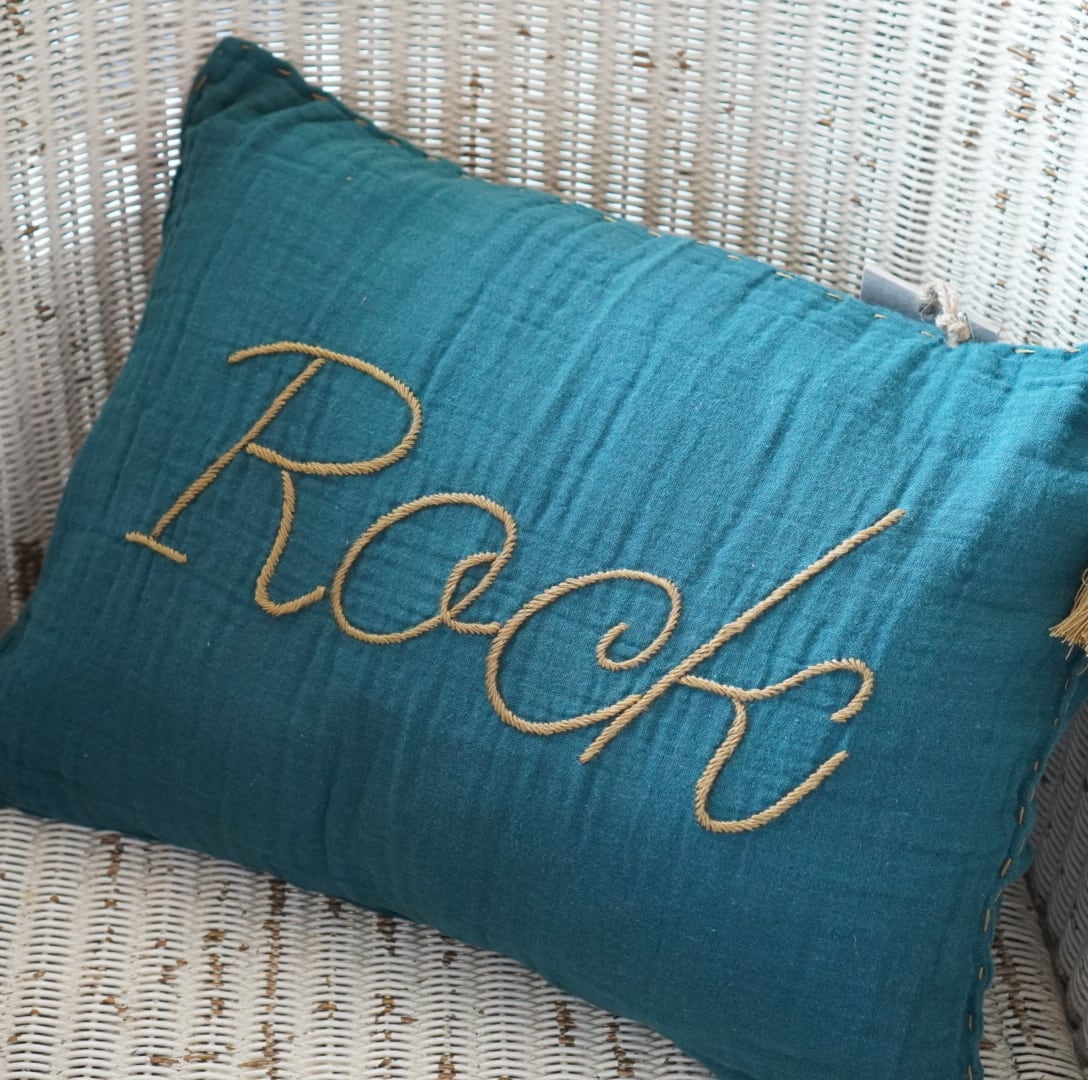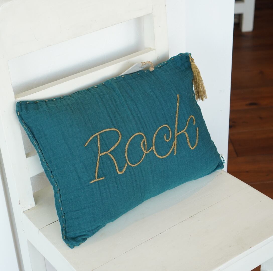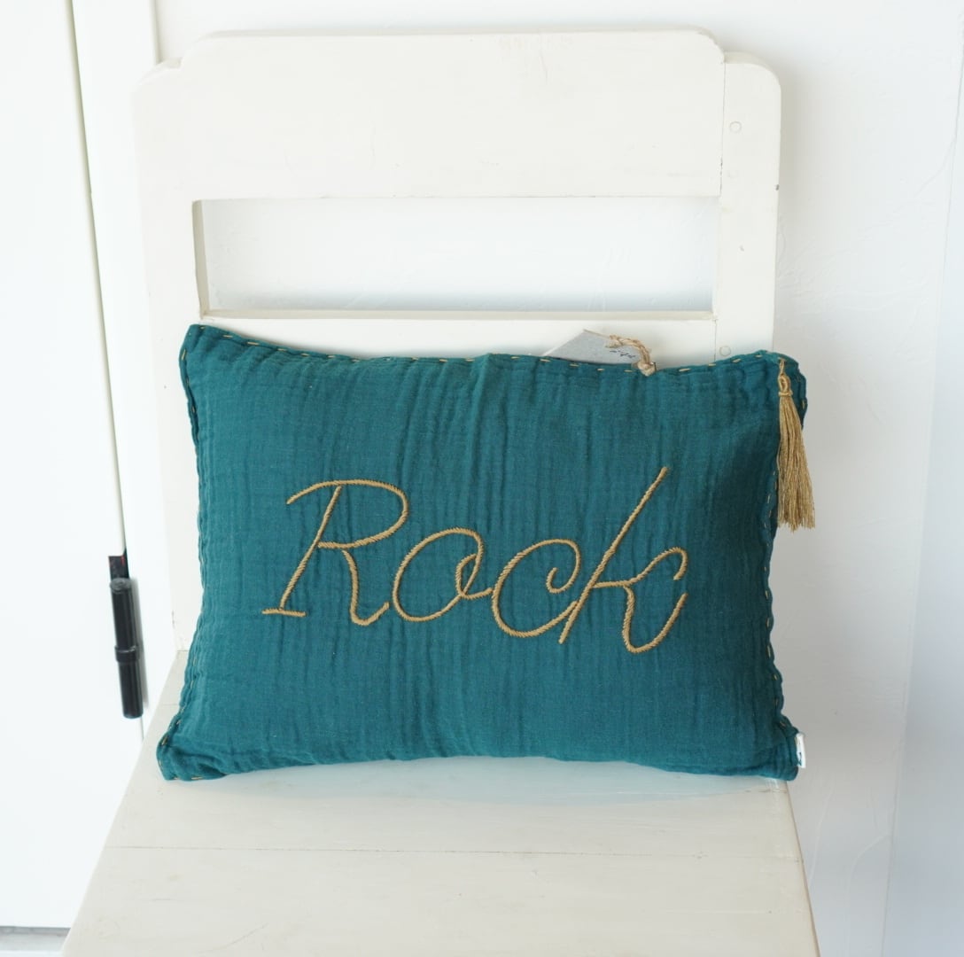 ティールブルーにゴールドの糸で”Rock”と刺繍された、ダブルガーゼの柔らかな肌触りのクッションカバーです。